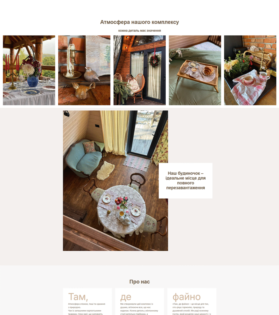 Розробка сайту для атмосферного місця у Закарпатті. Відпочинковий комплекс створений для спокою та відновлення після шаленого ритму міста та робочих буднів.